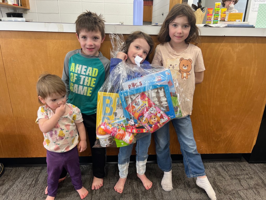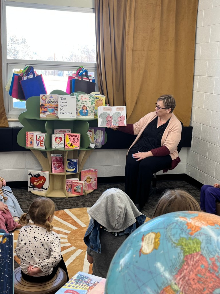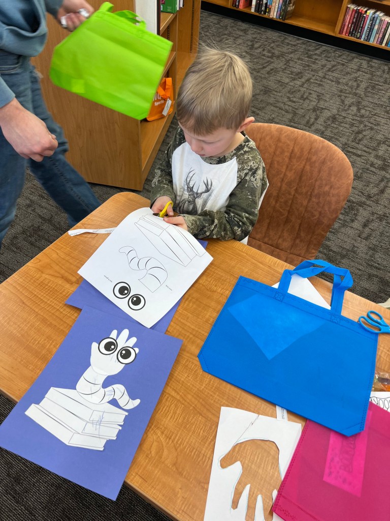Monday, Feb. 23 was another day filled with excitement at the library. We had a special story time with Ms Kate, with a special guest from the ND State Library! Mary read a book to the story time guests, and sang along with our fun story time songs. The kids made book worm crafts, and got their own book bag to fill with books.