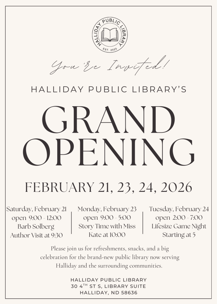 Join us for an author visit on Saturday, February 21, at 9:30 am mst, at the Halliday Public Library! This event will kick off our Grand Opening celebration. What an honor it is to be able to host this ND Author!